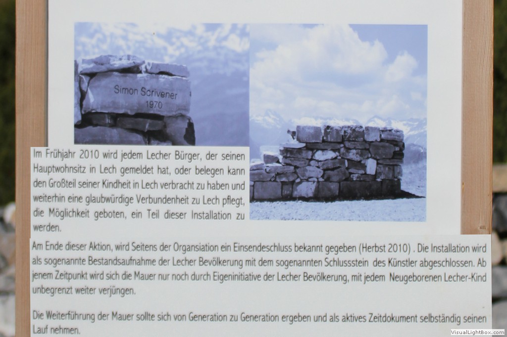 Im Frühjahr 2010 wird jedem Lecher Bürger, der seinen Hauptwohnsitz in Lech gemeldet hat, oder belegen kann den Großteil seiner Kindheit in Lech verbracht zu haben und weiterhin eine glaubwürdige Verbundenheit zu Lech pflegt, die Möglichkeit geboten, ein Teil dieser Installation zu werden. Die Installation wird als sogenannte Bestandsaufnahme der Lecher Bevölkerung mit dem sogenannten Schlussstein des Künstlers abgeschlossen. Ab jenem Zeitpunkt wird sich die Mauer nur noch durch Eigeninitiative der Lecher Bevölkerung, mit jedem Neugeborenen Lecher-Kind unbegrenzt weiter verjüngen. Die Weiterführung der Mauer sollte sich von Generation zu Generation ergeben und als aktives Zeitdokument selbständig seinen Lauf nehmen. |